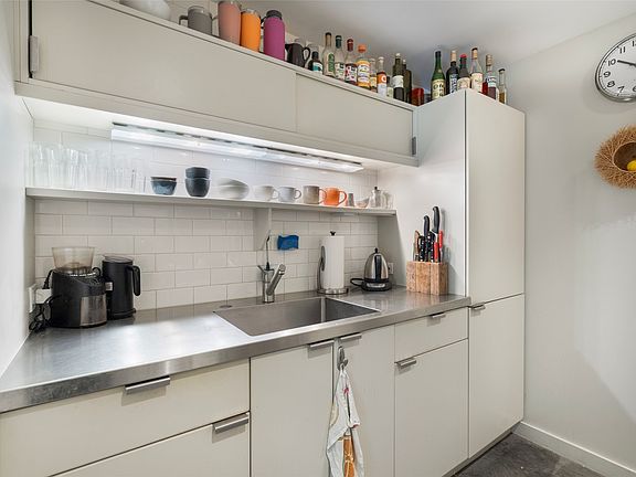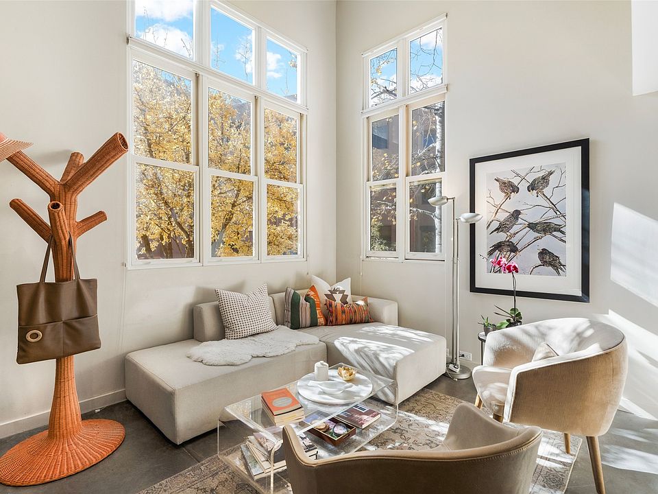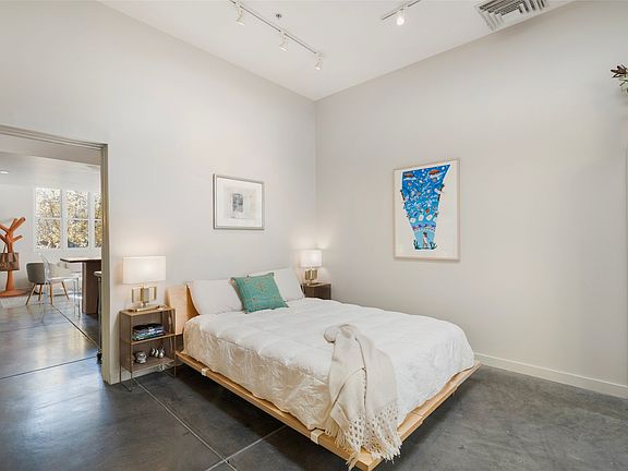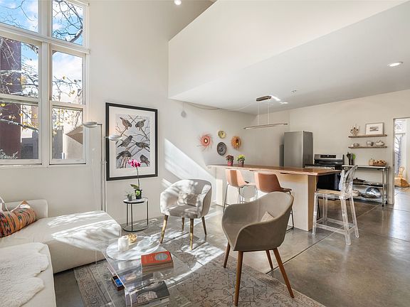 Set within the tranquil, landscaped interior of the Marquez Lofts complex, this bright, stylish condo--with no unit above it--has a desirable ground-floor entrance and rare, private back courtyard. The kitchen is creatively divided into two areas. Sink and storage are tucked tidily into a Butler's Pantry wing while a refrigerator and induction stove run along the wall behind the gorgeous, live edge, cherry and sapele wood dining counter by Boxcar Woody. A gentle flight of steps, with under-stair storage, leads to the sleeping loft. Downstairs, the spacious main bedroom has an ensuite, ¾ bath. Two double doors access the walled courtyard, perfect for pets or as an intimate retreat. Alternatively, with its back gate entry, this space could serve clients, leaving the main section for personal use. Graced with character, convenience and contemporary charm, this live-work dwelling favors the needs of creatives, entrepreneurs, and anyone seeking a residential refuge in a prime location by the Railyard, restaurants and shopping.