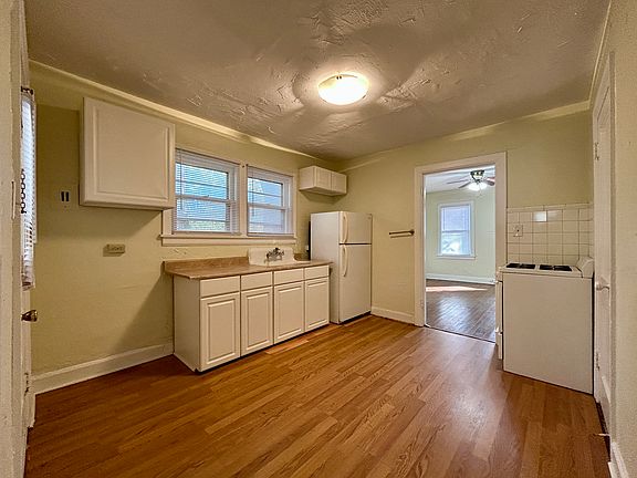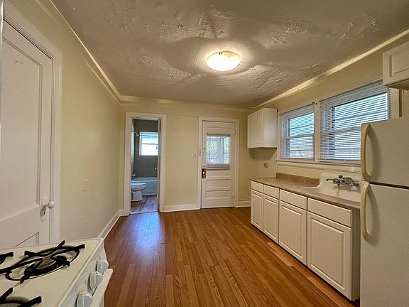 Rear efficiency unit with shared parking and alley access. Unit features updated bath room, original hardwoods in living/bedroom area, and covered back porch/storage area. Full bath accessible from hall and primary bedroom. Kitchen appliances include oven/range and refrigerator, plus large pantry/closet. Water bill paid; tenant responsible for all other utilities. Lawncare provided. Pets welcome with additional fee.