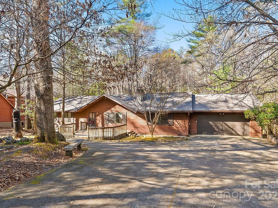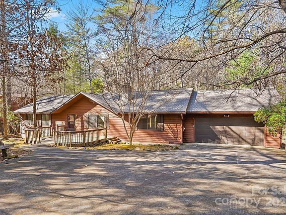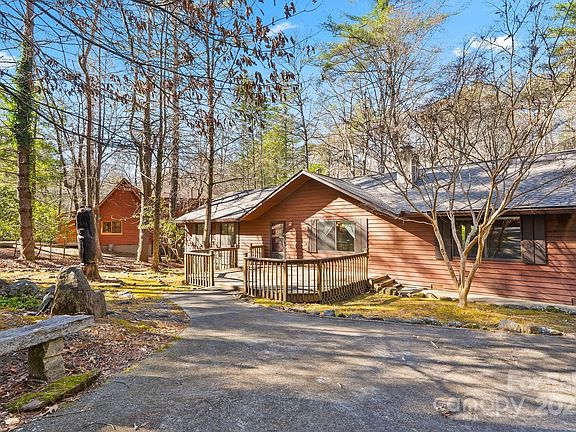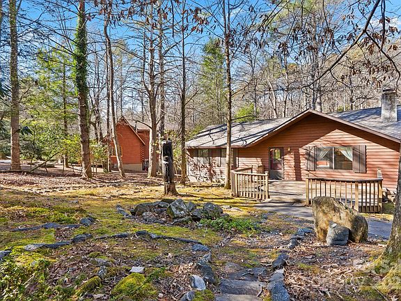 Finally! A One level open split floorplan that is light and bright. Home offers great outdoor space front and back with stone lined trails, a large deck overlooking the stream with small waterfall and pond. The sound is so relaxing. A flat yard with a stream is a rare thing in Connestee Falls. The large sunroom has large windows that let in that warm sunlight. A very comfortable layout featuring 3 bedrooms, 2 and a half baths plus a bonus room, gives great space for year round living or a seasonal home. This home offers new carpet and a new roof (10/2025). Buyer will owe a one-time fee of $13,500 paid at closing to CFPOA.