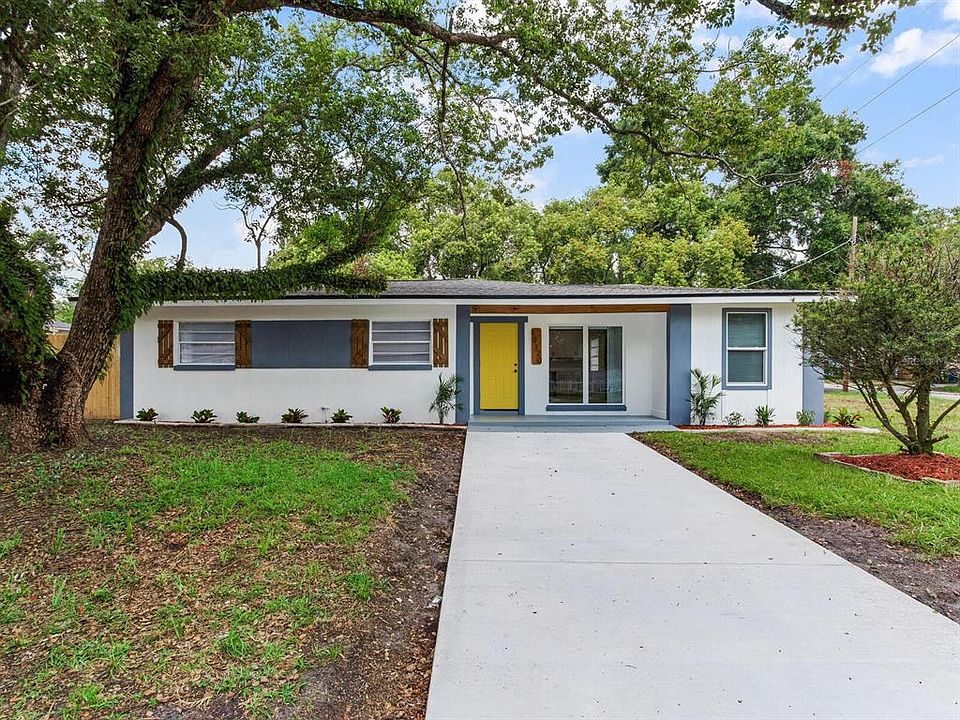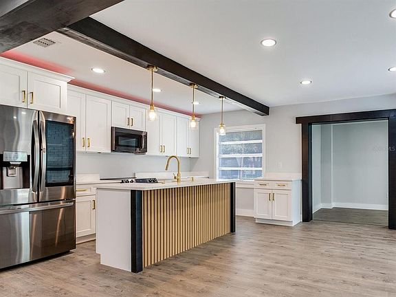 Welcome to your dream home on nearly a quarter acre in the heart of Tampa! Completely remodeled from the ground up, this property is essentially brand new while still offering a nod to mid-century modern design. From the moment you arrive, the curb appeal shines with matching mailbox, shutters, address sign, and front door beam. Inside, style is evident in every detail—the exposed beams contrast beautifully with fresh paint and highlight the soaring ceilings, while a painted fireplace warms the sleek and modern living space. Large windows fill the open layout with natural light, eliminating the need for daytime lighting. The designer kitchen is a showstopper with a quartz island perfect for gatherings, a deep gold farmhouse sink, above-cabinet lighting, and soft-close drawers. Off the main living area, a flexible bonus room with built-in shelving offers endless possibilities for a den, office, or formal dining room. The luxurious primary suite features a gold-accented ensuite with exquisite tile work, a spacious walk-in shower, and a barn-door entrance to a large closet. Three additional bedrooms are generously sized, complemented by a guest bathroom with the same level of detail and quality as the primary bath. Step outside to enjoy an oversized fenced backyard complete with a storage shed, large covered patio, and additional pavers for easy indoor-outdoor living. For peace of mind, every major element is new: roof, HVAC and ductwork, electrical, plumbing, interior and exterior paint, flooring, fixtures, appliances, and even some windows and fencing. Conveniently located near USF, Busch Gardens, Lowry Park Zoo, downtown Tampa, and with easy access to freeways and the airport, this home truly has it all—style, functionality, and an unbeatable location. The perfect opportunity for a lucky family or savvy investor to enjoy for years to come.