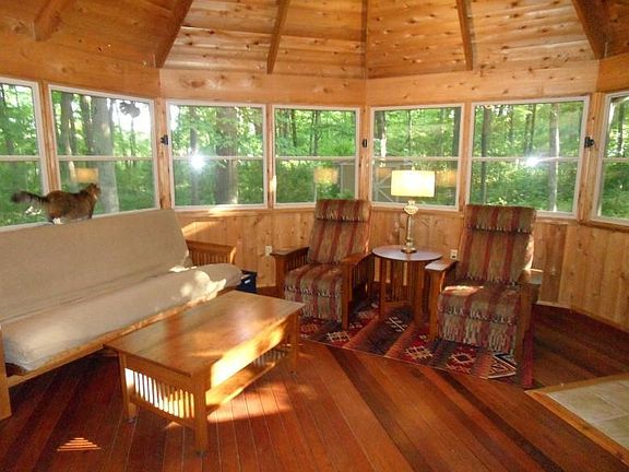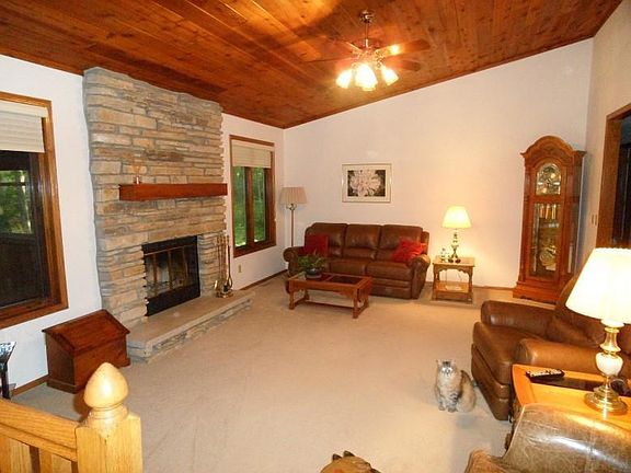 Own a little piece of heaven right here on earth. Beautiful ranch surrounded by wildlife, on a wooded 3/4+ acre. Spacious rooms w/large windows thru-out letting nature in. Beautiful GR with cedar vaulted ceiling & floor-to-ceiling Lannon stone NFP. Patio doors lead to octagon 3-season room with wood burning stove to warm you, top-of-the-line decking & door to the outdoor deck. HMS Home Warranty is ordered. Recent new assessment will reduce taxes to approx. $6K.