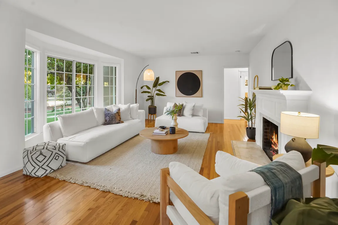 Framed by mature fruit trees and a soft stucco exterior, this well-maintained 1940s traditional jewel opens to bright, well-proportioned rooms featuring gleaming wood floors and an abundance of natural light. The large living room centers on a decorative fireplace and a wide bay window overlooking the front garden, with original trim ...