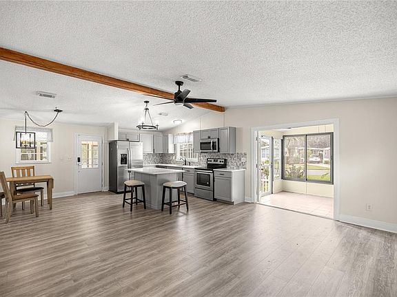 Welcome to this beautifully updated, move-in-ready home perfectly positioned on a desirable corner lot just minutes from The Villages—giving you quick access to world-class amenities, entertainment, golf, and dining options. Inside, you'll find new hardwood floors that create a warm and inviting ambiance throughout the main living areas. The kitchen boasts elegant quartz countertops, combining durability with upscale style—perfect for everyday living or entertaining guests. Built with long-term comfort in mind, this home features a coated membrane roof, known for its reliability and energy efficiency, along with a new AC and heat pump system to keep you comfortable year-round. Newer dual-pane windows allow natural light to pour in while improving insulation and reducing noise. Both bathrooms have been refreshed with refinished tubs and showers, and the interior laundry area adds everyday convenience. Whether you're looking for a full-time residence or a seasonal retreat, this home delivers a perfect mix of quality, comfort, and location. Don’t miss your chance to own a beautifully upgraded property just moments from all the lifestyle benefits The Villages has to provide.