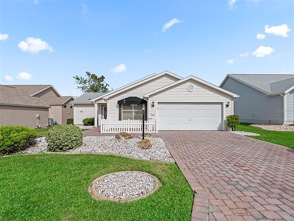 DESIGNER HOME, WATER FRONT!! NO BOND & FANTASTIC WATER VIEW!!—birds and wildlife from nearly every room! SPLIT FLOOR PLAN with an UPDATED eat-in kitchen: CROWNED WHITE CABINETS, STAINLESS STEEL appliances, & GRANITE counters, overseeing a Large combined dining/living area w/CROWN MOLDING, FLOOR TO CEILING MIRRORS that amplify light and the view, and BEAUTIFUL WOOD FLOORS... But the WOW-FACTOR of this home is the GORGEOUS FLORIDA ROOM fitted with HIGH-END WINDOWS, enhancing the VIEW.  Other HIGHLIGHTS: ROOF 2021, HVAC 2019, UPGRADED FANS & LIGHTING throughout, INSIDE LAUNDRY, and Brand new carpeting in the bedrooms.    The 2-CAR Garage has built-in CABINETS and an ATTIC pull-down LADDER leading to EXTENSIVE STORAGE!! Outside, a large lot showcases neat stone landscape beds with fresh mulch.    PRIME LOCATION: Just a mile and a half to SPANISH SPRINGS TOWN SQUARE and 3 miles to LAKE SUMTER LANDING!!!— JUST A MILE from TONS OF SHOPPING, DINING, GOLF, RECREATION, and medical. Come ENJOY THE VILLAGES with peaceful water views, a functional layout, and quality updates in one of The Villages’ most convenient areas.