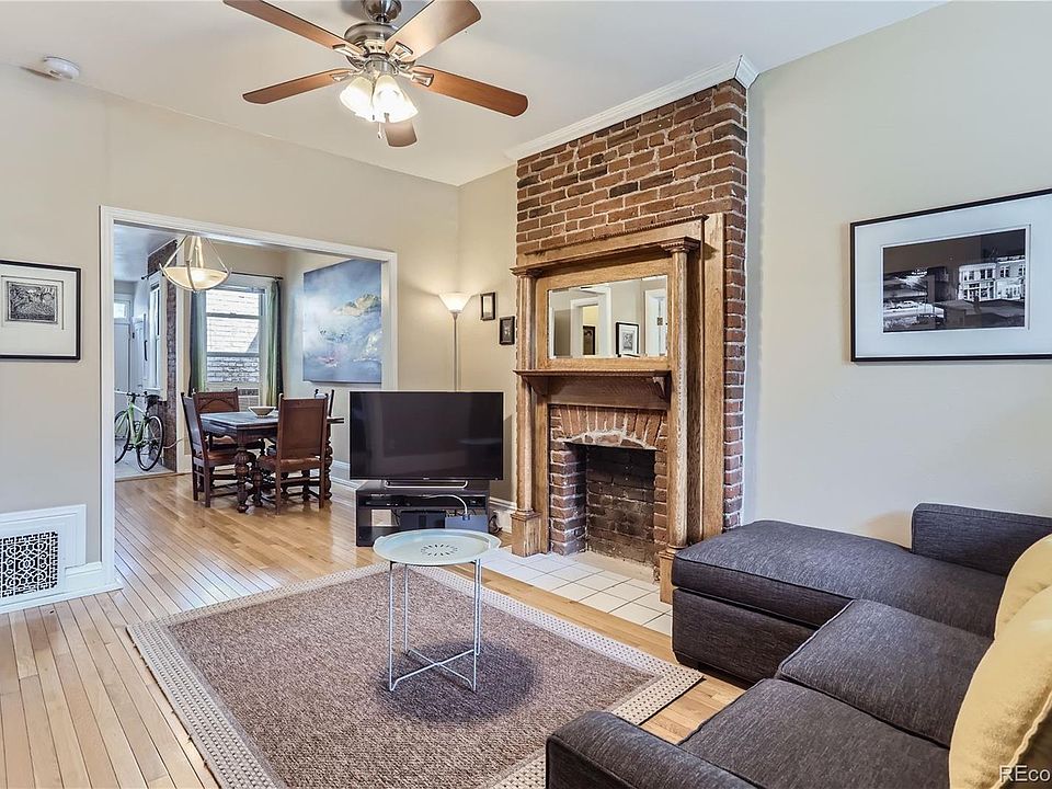 This ROWHOUSE CHARMER has turn of the century 1910 details plus everything fabulous Capital Hill has to offer; restaurants galore, entertainment, nearby Cheesman Park, Whole Foods and more! Newly restored/painted exterior dentil moulding/eyebrow/fascia, beautiful interior exposed brick walls, original and rare thin-slat wood flooring and built-ins, wide white-trim details, and the anchor-piece handcrafted fireplace mantle delightfully reminiscent of the era it was built! Nicely separated 2 bedrooms makes 2nd BR with double doors a sunny bedroom or ideal in-home office. Updated full bath with glass tiles is handy to both bedrooms. Rowhouse-style open living, dining, and kitchen area is great for entertaining. Kitchen boasts granite countertops, stainless appliances, handy pantry closet. Cellar basement has storage, sink and laundry! Back door opens to shared and fenced backyard. Newer roof and gutters. The homeowners have done a lot to the building in the last several years and the HOA is pro-active. Now it's ready for someone to enjoy the lovely "yesteryear" unit and a well run HOA in a remarkable location!