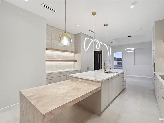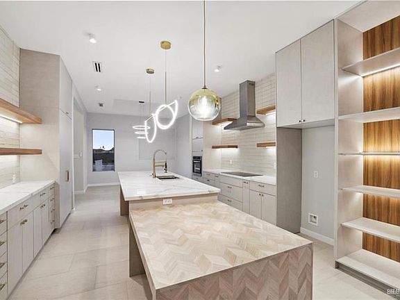 High ceilingsFloating shelvesModern designBeautiful kitchenElegant gold accentsCustom cabinetryOpen-concept layout