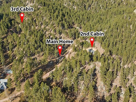 Listed by Pete Jensen, KWBH, 605-484-6713. **MOTIVATED SELLER- CONTRACT FOR DEED AVAILABLE!** Opportunity is knocking: here is your chance to own a once in a lifetime property in historic Keystone, SD! *Nestled on 14.53 acres of Black Hills beauty, this property offers 3 seasonal cabins, 3 garages and incredible potential- you must see to fully appreciate it *The land itself is a true gem- imagine picturesque rock formations, soaring pine trees, and abundant wildlife at your doorstep *Scattered pine trees throughout the property provide a natural canopy that adds to the serenity and privacy of this property *Direct sightlines to Mount Rushmore from the property's high points are an invitation to build your dream home *Get a firsthand glimpse of Keystone’s rich history right on this property- remnants of the old Global Mine are on the property, plus, less than 150 yards separates you from hundreds of USFS acres *In addition to the land, the 3 seasonal cabins offer living space plus income potential *The main house boasts cozy comforts—a wood fireplace, two bedrooms, a full kitchen and bathroom, private laundry, and a covered front porch *The second home is a canvas waiting for your personal touch—an almost blank slate with framed duplex potential, beckoning your DIY vision or a contractor's expertise to bring it to life *The property's third home offers another side by side duplex, complete with cozy living spaces, bathrooms, kitchenettes, covered patio areas and ample parking
