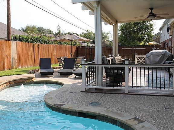 Welcome Home! Tastefully updated home in quiet neighborhood and great school district. Family friendly floor plan & back yard are perfect for entertaining. The pool is heated to increase your swim season, & features salt water, tanning ledge, bubblers & water falls. Spacious bedrooms have a 3-way split to accommodate children or aging parents. Master is down with garden tub, dual sinks & a custom designed closet! Wood floors throughout downstairs living areas, granite counter tops, surround sound wiring, full sprinkler system, 2-story living area, covered patio includes speakers & mounted TV! Tanglewood neighborhood has nice common areas & convenience to the heart of Mansfield. Don't miss this home!