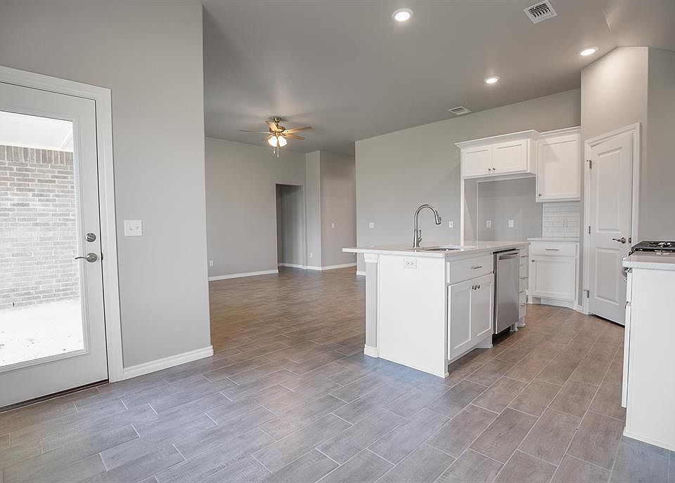 FENCING AND BLINDS INCLUDED! This Tero floor plan includes 1,680 Sq Ft of total living space, which includes 1,565 Sq Ft of indoor living space and 115 Sq Ft of outdoor living space. There's also a 385 Sq Ft, 2-car garage with a storm shelter installed. This affordable home offers 4 bedrooms, 2 full baths, covered patios, and a utility room. The great room welcomes large windows, wood-look tile, a ceiling fan, and Cat6 wiring. The charming kitchen has 3 CM countertops, stainless-steel appliances, wood-look tile, well-crafted cabinets with decorative hardware, a center island, and stylish tile backsplash. The primary suite is straight ahead and supports carpet flooring, a ceiling fan, and the perfect sized windows. The attached primary bath suits a dual sink vanity with an elegant countertop selection, a walk-in shower, an elongated water saving toilet, and a HUGE walk-in closet! The outdoor living section is covered and has fully sodded yards with smart home irrigation control. Other amenities include a tankless water heater, a fresh air intake system, and MORE!