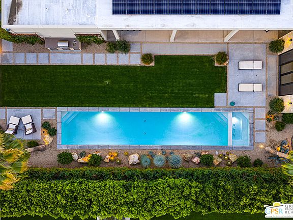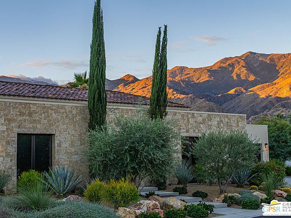 In the guard-gated community of Monte Sereno, this modern villa designed by award-winning architect Anthony Poon is a masterclass in proportion, restraint, and refined modernism. Architecture, light, and landscape come together to capture the essence of Palm Springs living at its very best. Located on fee land in South Palm Springs, the home sits on a premium south-facing lot with unobstructed western views of Mt. San Jacinto from both the pool and primary suite. Interiors by Paxton Lockwood Design of Aspen unfold in a palette of collected calm. The tremendous great room erases the boundary between indoors and out through walls of glass, centering on a sleek chef's kitchen with dual islands, premium cabinetry, high-end appliances, and designer lighting. The primary suite is a true retreat, with oversized sliders opening directly to the pool and lawn, an expansive walk-through closet, and a spa-caliber bath featuring walk-in dual shower and a freestanding tub framed by a verdant exterior landscape. Two additional generously sized ensuite bedrooms offer excellent separation and privacy for guests. Outside, an architectural pool reflects the mountain backdrop, while the pool pavilion functions as an additional lounge with fireplace, outdoor shower, and a hidden raised garden. Landscape architecture by Steve Rogers of Studio Desertscape layers native plants, boulders, and textures into a tranquil desert oasis. A rare combination of architectural pedigree, elevated interiors, and a premier location this villa represents modern desert living at its finest. Additional features include: owned solar, an air-conditioned four-car tandem garage, and oversized laundry and pantry storage.