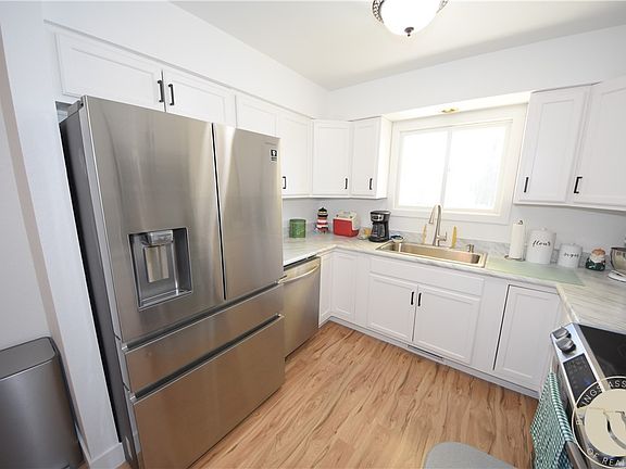 Freshly updated kitchen, living and dining areas in this well cared for home. New cabinets, counters and stainless appliances make the kitchen bright and inviting. The living room and large dining have an open concept and are complimented by the updated paint and flooring. There is a patio door off of the dining room that leads to large back deck looking out into the landscaped and fenced yard which is adjacent to the edge of town and the big ditch which provides irrigation water for the yard seasonally (annual pumping contract). The basement has 3 non-egress bedrooms, laundry/bath combo extra storage areas and a bonus/fam room area.