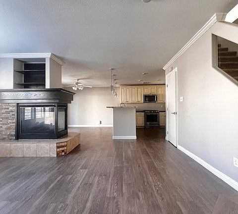 Covered patioShutters on the windowsCeiling lightsCrown moldingKitchen with granite barTwo-way fireplaceCustom tile and mantle