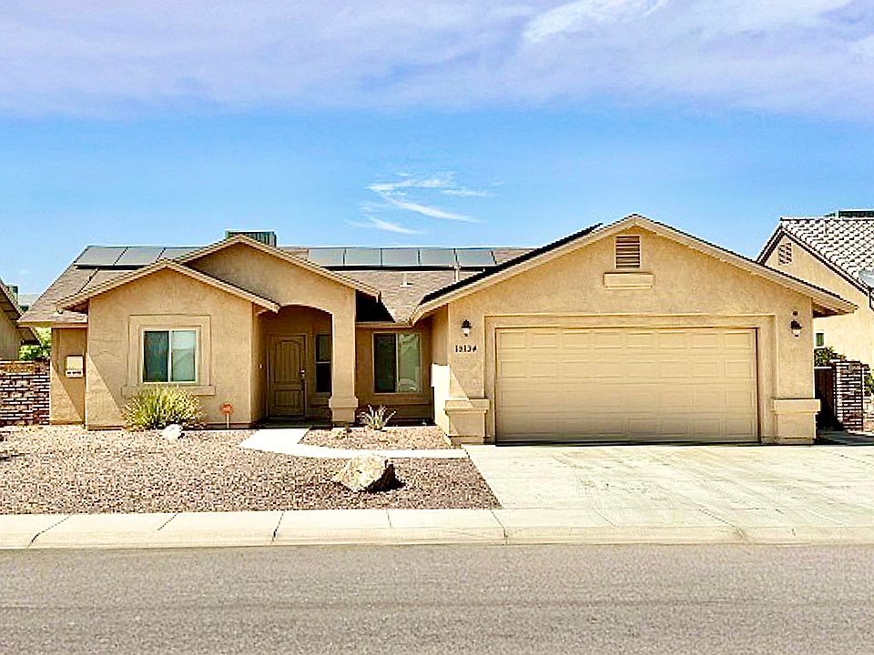 Move in ready 4 bedroom, 2 bath home featuring a functional split floor plan. Interior highlights include tile and wood laminate flooring in main areas, carpeted bedrooms, and ceiling fans throughout. The kitchen offers granite countertops, island with breakfast bar seating, and stainless steel appliances. Step outside to a covered patio and fully fenced backyard. Additional features include a two car garage, single side gate and solar panels providing energy savings.
