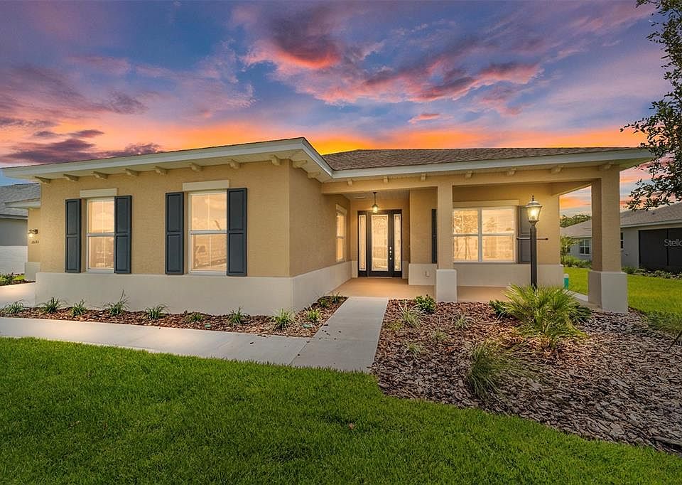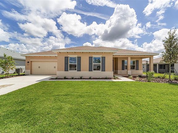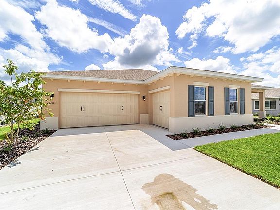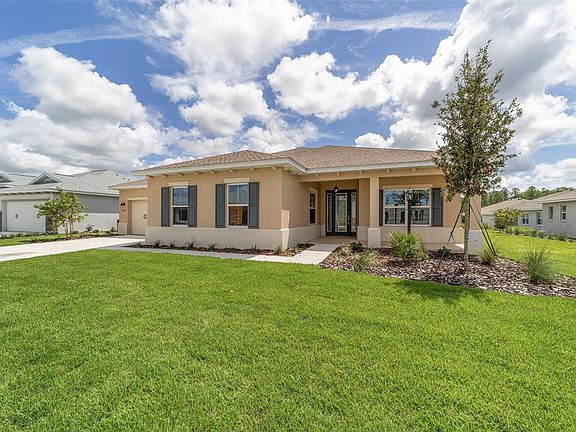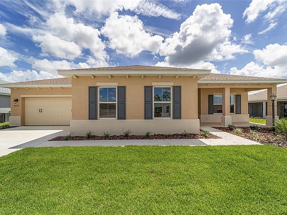 Welcome to the Magnolia Model, a beautifully designed new construction home located in the desirable LongLeaf Ridge neighborhood at On Top of the World, Ocala’s premier 55+ active adult community. This home offers 2 bedrooms, 2.5 bathrooms, a versatile flex room, an oversized 2-car garage, and a separate attached golf cart garage. Step inside to find tray ceilings, tile flooring throughout, and an open floor plan that perfectly combines style and functionality. At the front of the home, the flex room with French doors creates a private space for a home office or hobby room. The living area is light and bright, featuring a 4-panel sliding door that opens to the screened lanai, ideal for indoor-outdoor living. The dining space, highlighted by four floor-to-ceiling windows overlooking the backyard, creates a stunning backdrop for everyday meals and entertaining. The gourmet kitchen showcases quartz countertops, premium white staggered cabinetry with crown molding, under-cabinet lighting, stainless steel appliances, and a walk-in pantry—a perfect blend of beauty and convenience. The primary suite is a spacious retreat with a tray ceiling, a large 3-panel window with blinds, and a huge walk-in closet. The spa-inspired en suite features a double vanity with quartz counters and a zero-entry tiled shower with built-in bench and glass enclosure, offering both accessibility and luxury. With its elegant finishes, thoughtful layout, and outstanding community amenities, this Magnolia model is designed for both comfort and style. Don’t miss your opportunity to own a brand-new home in On Top of the World—schedule your private showing today!