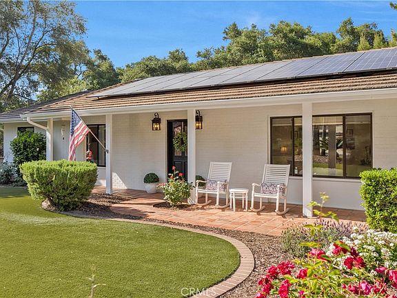 Welcome home to 10136 Rancho Roble Road, located in the highly sought-after community of Hidden Meadows in Escondido. This serene single-story estate is nestled on an expansive 1.16-acre flat, park-like lot on a cul-de-sac street, featuring over $250,000 in upgrades—and no HOA! Enter through your private automated custom wrought-iron gate and down an impressive driveway into a nature sanctuary surrounding a charming ranch-style home. The grounds include mature trees, extensive hardscaping, a 1,900 sq. ft. turf lawn, and majestic boulders. The designer kitchen boasts stainless steel appliances, including a Frigidaire induction range, Taj Mahal quartzite countertops with a waterfall peninsula, and pendant lighting. Unwind by the wood-burning brick fireplace in the family room while enjoying music from the built-in surround sound system. The dining room is highlighted by a stunning crystal chandelier and large windows that allow abundant natural light. The formal living room provides a versatile space that can serve as a secondary office or multi-use area. Retreat to the spacious primary suite, featuring sliding doors to the backyard, a sauna, RH sconces, and an en-suite bathroom with a walk-in shower and separate soaking tub. Two additional bedrooms include statement light fixtures and mirrored closet doors. The secondary bathroom features Carrara marble flooring, a glass walk-in shower, and an RH wood vanity with polished nickel fixtures. Additional upgrades include freshly painted interior and exterior, Knotty Alder wood doors, LVP flooring, recessed lighting, a new roof, and a fully owned solar system with an LG battery. This property is a car enthusiast’s dream—featuring a custom garage with Swisstrax flooring, slatwall racks, hexagon lighting, and ample parking space for an RV, additional vehicles, or a boat. Dine al fresco under the covered patio with skylights while enjoying picturesque views of your tranquil backyard. The outdoor kitchen includes a built-in BBQ, two gas side burners, and a stamped concrete patio area. Also on the property is a detached "she shed"—perfect for a home office or yoga studio—complete with LVP flooring, heating and AC, electrical, and glass doors, along with a redwood swing set. This property offers a true escape with a secluded feel, all while being conveniently located with easy access to the I-15 and just a short drive to local markets, Boulder Oaks Golf Club, scenic hiking and biking trails, and more!