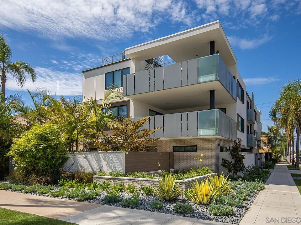 Stunning 3-bedroom top floor condo newly built in 2019 with private roof terrace to enjoy views of the San Diego skyline and the iconic Coronado Bridge. The open-concept great room has stacking slider doors to an outdoor balcony, perfect for indoor/outdoor entertaining. Gourmet kitchen includes island seating, Wolf range/oven with 6 burners, Subzero refrigerator with 2 freezer drawers, and microwave drawer. Elegant oak wood flooring flows throughout, complementing the modern design and spacious layout. Includes a two-car tandem garage and separate storage room. Elevator opens into the unit with secure private access.