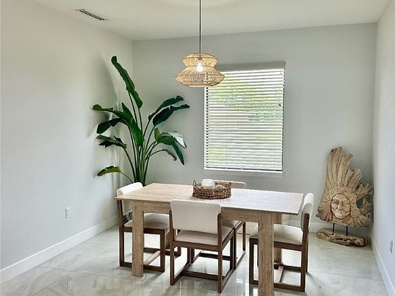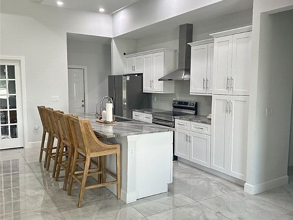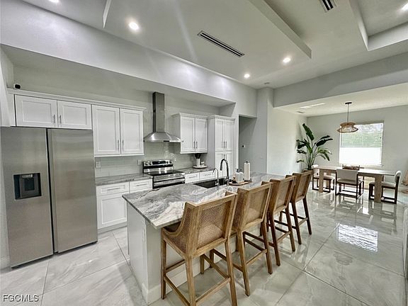 MOVE IN READY, FULLY FURNISHED! This luxurious 4 bed, 2 bath custom-built home blends upscale finishes with thoughtful design, featuring impact-resistant windows and doors, epoxy-coated garage flooring, and a pavered driveway. Inside, enjoy a spacious living room with a fireplace insert, custom wood shelving for family photos, modern kitchen cabinetry, and a full stainless-steel appliance set including a washer and dryer. Both bathrooms showcase custom-framed mirrors, with the master offering dual sinks and two individual mirrors across from a beautifully tiled walk-in shower. This property offers optional furnishings such as mounted TVs, bed frames, an expandable dining table with chairs, bar stools, a king-size bedroom suite with dresser and nightstands, queen bed frame, to add move-in convenience. This home also includes a comprehensive alarm system with entry sensors installed on every door and window for enhanced security and peace of mind from the day you move in. Not to mention the very spacious screened lanai invites outdoor living with an outdoor kitchen and 8-piece sectional lounge set, while the fully enclosed PVC fenced backyard offers privacy, security, and space for pets or play. Fully furnished and thoughtfully accessorized, this home is truly move-in ready, offering a seamless blend of comfort, style, and convenience from day one.