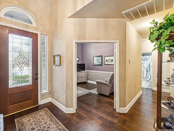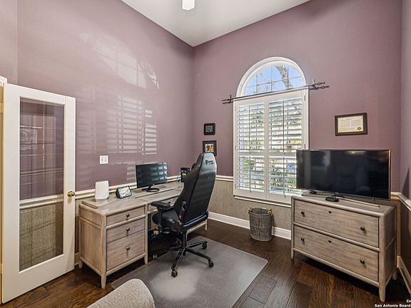 Welcome to this beautifully maintained former model home, situated on a quiet cul-de-sac within the desirable gated community of Springs of Stone Oak. This 3-bedroom, 2.5-bath residence offers sophistication, comfort, and thoughtful upgrades throughout. Step inside to soaring high ceilings, a cozy fireplace, and plantation shutters that add timeless elegance. A dedicated office provides the perfect work-from-home space, while a separate dining room is ideal for gatherings and entertaining. The spacious kitchen features an island, upgraded Shelf Genie storage, and ample counter space for cooking and hosting. The remodeled primary bathroom and updated secondary baths create a fresh, modern feel. Additional upgrades include a water softener, tankless water heater, irrigation system, new windows, and a custom deck perfect for outdoor dining or relaxing. Outside, the serene backyard becomes your private oasis with a tranquil waterfall feature. Residents of Springs of Stone Oak enjoy access to a private neighborhood park and playground, along with the convenience of nearby shopping, dining, and top-rated schools. A rare opportunity to own a former model home with exceptional care and improvements-move-in ready.