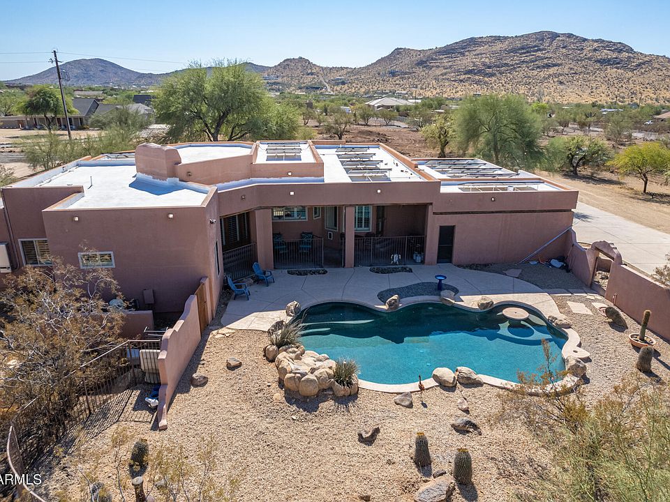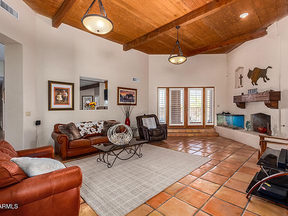 Picture yourself horseback surrounded by mountain views & spectacular sunsets. Experience the true Western vibe that is everything Arizona. This impressive 2.5 acre property is well designed with a 2699sf home, 5 stall mare motel, tack shed, feed storage, wash rack, turn outs & cooled dog shed. Room to ride on your own property. Enter this welcoming home under vaulted wood plank ceilings w/Saltillo tile floors, art nooks & stylish architecture. Isl kitchen flows well w/granite cntrs, brkfst bar, knotty pine cabinets, SS applcs & walk-in pantry. Huge primary w/FP, dbl sinks, sep tub/shwr & patio exit. North facing cvrd patio overlooks picturesque pebble-tec pool & social area, ready for friends, family & BBQ's. End of the road privacy. Newer HVAC's. Private well. Room for toys & trailers!