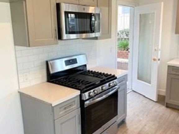 Laminate floorsUsb plugs in kitchenStainless steel appliancesRecessed lightingQuartz counter topsDesigner gray shaker cabinetsCeiling fan in bedroom