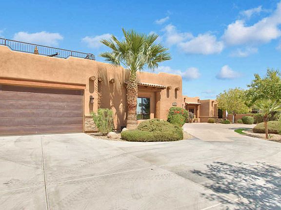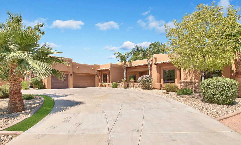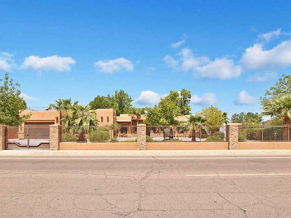 Masterful design & classic comfort are uniquely embodied in this 6BR or 5BR + Den/5BA custom home. Allow 5,666 SQ FT to introduce an open floor plan w/ a step down living & family rooms featuring a panoramic view out to the park style back-yard. Open kitchen w/ upgraded cabinetry & granite countertops + full service bar! Escape into a GORGEOUS master suite, including his & her closets w/ built-in shelving, in-closet washer/dryer, snail shower, jacuzzi tub, fireplace, surround sound stereo system & full service bar + entertain in the theater room or work-out in the full gym. Getaway to a resort-style backyard that truly has it all! HUGE covered patio, a diving pool, hot tub, tranquil-lily pond, built-in BBQ, putting green & 1,000 SQ FT rooftop view-deck, perfect for twilight stargazing! Incredible upgrades include a climate-controlled wine cellar with approx. 1,000-bottle capacity, 3 private gates, 3.5 & 2-car garages w/ epoxy flooring & cabinetry allow for extra storage, while an extended driveway allocates space for RVs w/ sanitation dump station & power hook-up in the rear. SUPERIOR LOCATION! Only 20 min from Downtown Phoenix & Scottsdale, close to Loop 101 & Loop 202 freeways!