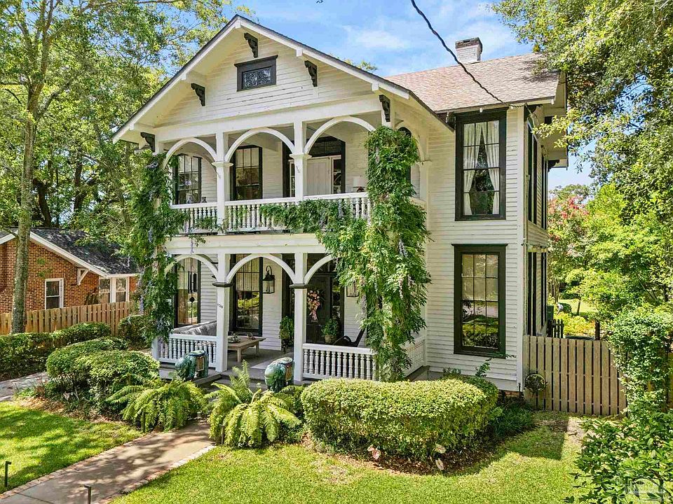 Rich heritage abounds in this extraordinary Victorian estate. Rebuilt on its current site, using elements from Pensacola’s first schoolhouse, this grand two-story property is a testament to timeless design, classic craftsmanship, and meticulous stewardship. Spanning over 2,600 square feet on a generously sized 0.33-acre lot, the home features four spacious bedrooms, two refined bathrooms, and a layout that flows with both grace and purpose. Towering 11-foot ceilings and stately 9-foot windows allow natural light to pour into each room, illuminating the warmth of original heart pine flooring, intricate moldings, and 9-inch baseboards. Period charm abounds in every room—from the grand dining space to the expansive living area and intimate first-floor secretary’s nook. The kitchen and bathrooms have been thoughtfully remodeled over the years, blending historic elegance with updated finishes and convenience. Modern upgrades include new electrical wiring, two recently replaced HVAC systems, a tankless water heater, and a brand-new roof installed Sept 2025—ensuring the comforts of today remain at the forefront. Outside, the magic continues. Twin porches—one on each floor—capture gentle breezes and offer front-row views of majestic heritage oaks. A 35’x 23’ brick patio, winding garden paths, and charming brick walkways invite you to entertain or unwind in a lush, private setting. The beautifully-landscaped yard includes a detached, oversized two-car garage, a fully heated and cooled bonus studio ideal for an artist’s retreat or office, and a powered garden shed perfect for additional storage for your passions and projects. Located in the heart of East Hill, you’re just minutes from vibrant downtown Pensacola, schools, local eateries, medical centers, and military bases. Rarely does a property of such historic significance, architectural grace, and thoughtful modernization come to market. This is more than a home—it’s a legacy waiting to be shared.
