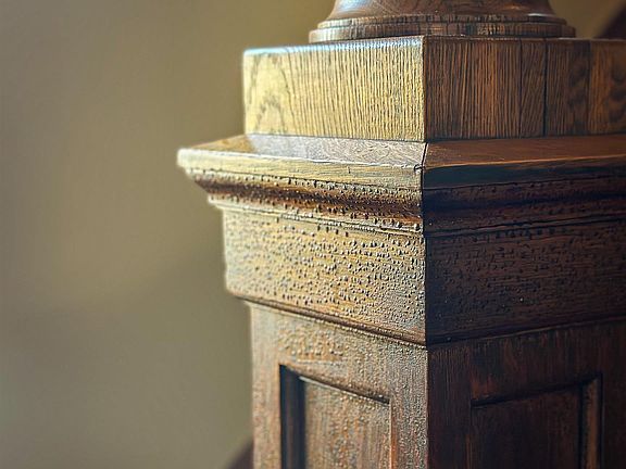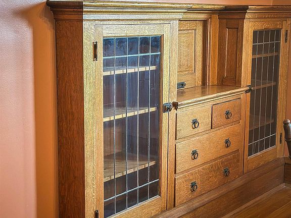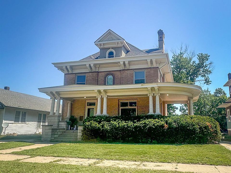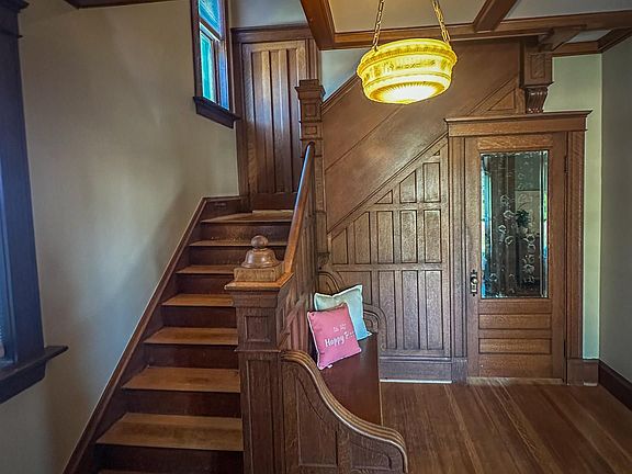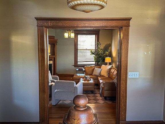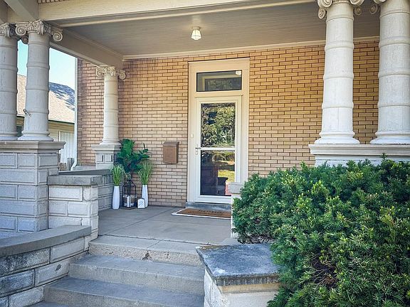 Step into timeless elegance with this stately 1910 brick and stone mansion. A curved wraparound stone porch sets the tone, leading into a grand foyer with exposed staircase, box molding, and stately newel posts. The living room showcases oak pocket doors, a fireplace, wood-beamed ceiling, and beveled-glass windows that flood the space with light. The formal dining room is built for entertaining with space for a 12-person table, a built-in buffet with pass-through, and a second ornate fireplace. The kitchen offers abundant storage and a large prep island. Upstairs, find four spacious bedrooms with soaring 9-foot ceilings and a full bath. The walk-up attic features two additional nonconforming rooms plus storage. The basement offers 8-foot walls in excellent condition, a half bath with potential to finish into a full, and ample storage. Outside, enjoy a large yard with privacy fence, two-stall garage, and the enduring character of early 20th-century craftsmanship.