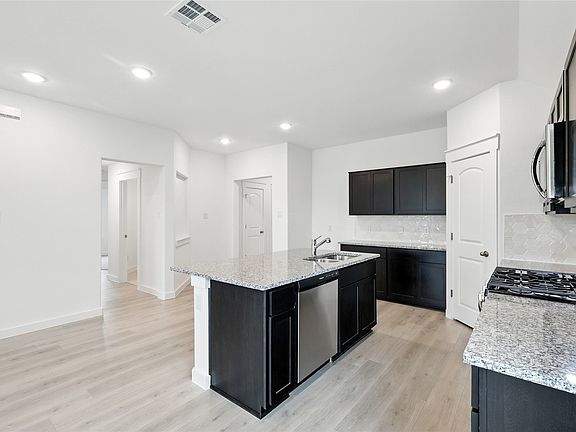 This thoughtfully designed home seamlessly combines comfort, style, and functionality, making it an ideal sanctuary. Welcome to The Kimbell, a beautifully crafted single-story Brightland Home offering 2,204 sq ft of thoughtfully designed living space that blends comfort, style, and function. With an open-concept layout at its core, this home is perfect for modern living, creating a seamless flow between the spacious great room, chef-inspired kitchen, and inviting dining areas. The kitchen is a true centerpiece, equipped with sleek stainless steel appliances, custom cabinetry, elegant granite countertops, a ceramic tile backsplash, and an expansive island ideal for prepping, serving, or gathering. A large pantry provides plenty of storage, while natural light fills the adjacent great room, creating a warm, welcoming atmosphere for family and guests. The private owner’s suite is set apart from the main living areas to ensure maximum privacy and tranquility. This luxurious retreat features a generously sized bedroom, spa-like ensuite with dual sink vanity, a large shower, a fixed glass window that adds natural light, and an enlarged closet offering ample space for all your wardrobe needs. Three additional bedrooms and a versatile flex room are thoughtfully positioned in their own sections of the home, perfect for children, guests, or a home office. Structural and design highlights include a premium brick exterior with buff mortar, energy-efficient windows, LED disc lighting, and a fully finished garage. Interior upgrades such as mixed flooring, carpet, tile, and luxury vinyl plank, enhance both aesthetics and practicality. Every detail of The Kimbell reflects intentional design and elevated comfort, making it a place you’ll love to call home. Located in one of Forney's most desirable neighborhoods, Walden Pond, this community is rich in natural beauty.