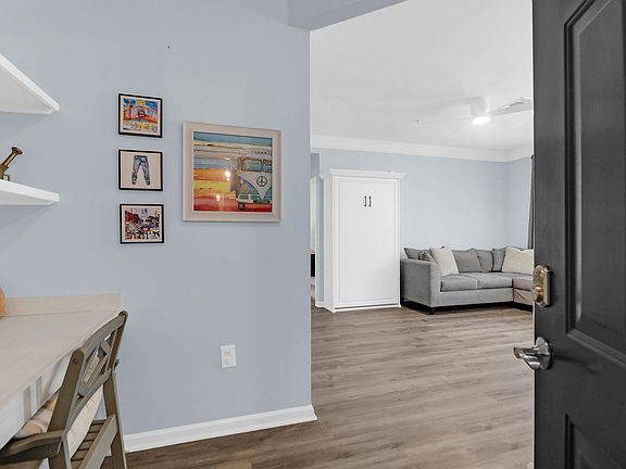 Tucked away behind the stately gates of Southampton Pointe, Mt. Pleasant's premier and private condominium community, is 1014 Rosewood Lane, a one-level, 1st floor condo waiting for you! Only steps away from the resort-like pool, this condo offers efficient and modern customizations such as attractive laminate flooring throughout living areas, with carpet in primary bedroom, custom cabinets to the ceiling in the kitchen, adorable banquette in the dining area, professionally designed walk-in primary closet, clever Murphy bed hidden inside a custom cabinet, and most recently, a screened porch was added to give you a private outdoor space to enjoy these lowcountry mornings and evenings! New and modern white kitchen appliances were recently added: a new electric range and refrigerator!The kitchen also features a custom backsplash with beautiful granite countertops, and some slide-out shelving in the cabinets. Designer plantation shutters were added throughout the home as well, allowing ample natural light to stream through. The primary bedroom features access to the screened porch for your morning coffee! Smooth, 9' ceilings are found throughout, except for Primary bedroom. Southampton Pointe offers a beautiful club house with access to a resort-like pool, gym/workout space, pickleball court, grilling and picnic areas, dog park, and car wash! Now is your chance to live so close to everything you love: the beaches, downtown Charleston, delicious restaurants, and fabulous shopping at 1014 Rosewood Lane!