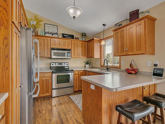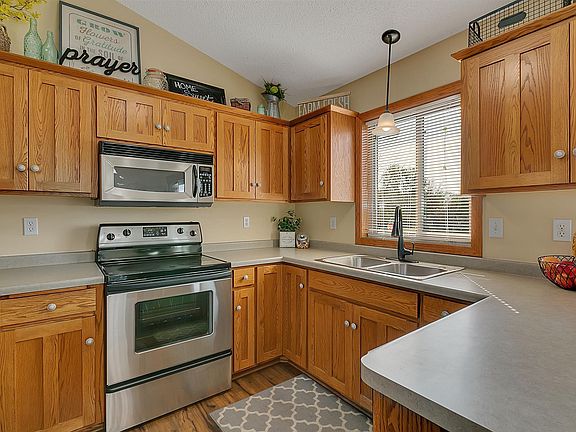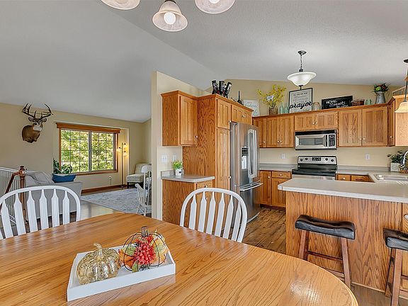 What A Great Place To Call Home! Kitchen offers beautiful oak cabinets w/lot of storage and prep space, pantry, lazy susanne. Dining room w /patio door leads to 12x14 deck and great views of Lower Spunk Lake. Open floor plan offers lots of natural lighting, vaulted ceiling and storage through out. 4 Bedroom and 2 bath home! Good size master bedroom and WIC, Full bathroom on the main with dual vanity. Lower level offers large family room and gas fireplace, office (or 5th bedroom needs closet) another 2 good size bedrooms w/closet organizer. 3/4 bath, over 2300 sq ft finished! Laundry room has ceramic tile floors, soaker sink and washer & dryer. Over sized foyer entry, 3 stall garage 30x27 that's insulated & heated, sprinklers, fenced in backyard, nicely landscaping, corner lot. Vinyl siding, CA, gutters, asphalt driveway.