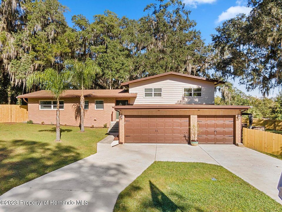 **Active under contract - accepting back up offers** Welcome to your own piece of paradise in the city of Brooksville! This stunning 4-bedroom, 3-bathroom, 3-car garage, tri-level home is the perfect combination of modern updates and classic charm! Pride of ownership is shown in every detail from the beautiful landscaping to the meticulously maintained interior! Almost everything has been updated, all it is missing is you! Large enough for that growing family AND as a bonus, the design works great for multigenerational living. The front door welcomes you to the main floor (2nd level) where you will find your master bedroom with ensuite bathroom and huge walk-in closet! Additionally, there are two more bedrooms (one with beautiful built-ins) and another bathroom. Downstairs, there is a 4th bedroom, an office, living area, kitchenette, utility and laundry closets! On the third level, you will find the open-concept kitchen, family room and dining room. Incredible oak floors grace this area along with almost wall to wall windows allowing in tons of natural light! The kitchen features granite countertops, a cooking island and stainless-steel appliances! But it's not just what's inside that makes this property so desirable - enjoy a spacious backyard at .63 acres, featuring a huge deck and awning overlooking your own private outdoor paradise. Just imagine those long summer nights spent relaxing on your large patio deck or grilling out in the backyard. Have lots of toys? Don't worry, this magnificent property has you covered! It has not one, but TWO storage sheds AND a 3car garage! Plus, you won't sacrifice convenience for tranquility – this home is located in city limits so you can enjoy all that downtown Brooksville has to offer! This gem won't be around forever – call now before it's gone!