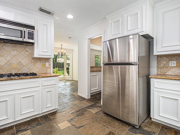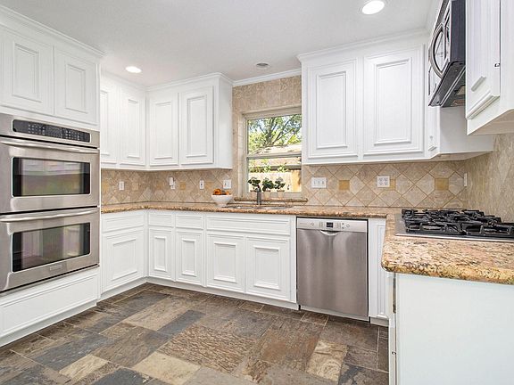 Gas log fireplaceStylish backsplashDetached garageLaminate flooringExpansive backyardRecessed lightingSlate flooring