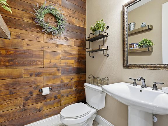 One of the secondary bedrooms includes its own private en-suite bathroom — perfect for guests, multigenerational living, or a teen suite. Additional upscale touches include oil-rubbed bronze fixtures, a stone fireplace with cedar mantle, and built-in surround sound wiring with speakers.