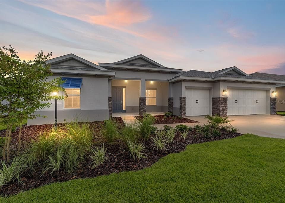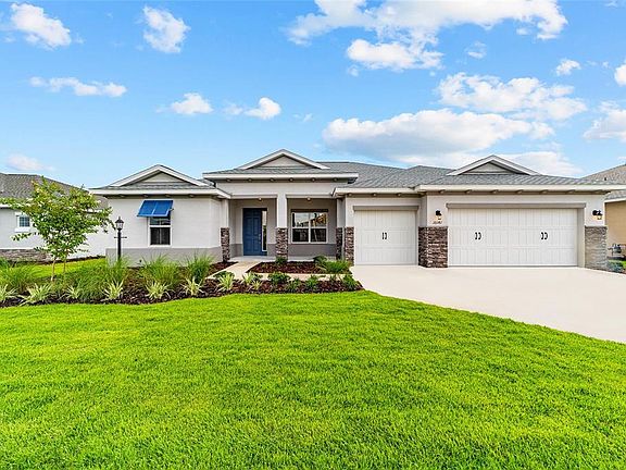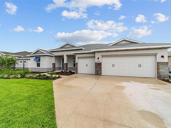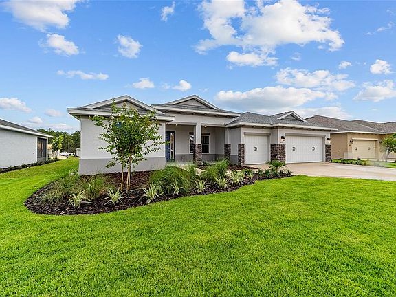 Welcome to the Beatrix model in the sought-after LongLeaf Ridge neighborhood of On Top of the World—Ocala’s premier 55+ active adult community. This brand-new home blends modern design with thoughtful details to create a perfect retreat. Inside, the open-concept floorplan features a bright great room and a stunning kitchen with staggered cabinets crowned with molding, stainless steel appliances, under-cabinet lighting, an oversized island, and a spacious pantry. Just off the main living area is a versatile flex room with French doors and a closet, ideal for a home office, den, or guest space. The owner’s suite is a true highlight, complete with a 3-panel window overlooking the backyard, a generous walk-in closet, and a spa-like en suite bath. The bathroom includes a double vanity with quartz countertop, zero-entry tiled shower with bench, and a linen closet. For added convenience, the laundry room connects directly to the master closet. The guest bedroom includes a closet and window with blinds and is conveniently located next to the guest bath, which features a single vanity with quartz countertop and a tiled tub/shower combination. Step outside to enjoy your covered lanai—perfect for morning coffee or evening relaxation. Built with energy-efficient construction and today’s most desirable finishes, this home offers both comfort and style. Living in On Top of the World means access to world-class amenities, including golf courses, resort-style pools, fitness centers, pickleball, tennis, and countless clubs and activities—all within a golf cart-friendly community. Don’t miss your chance to own this beautiful new construction home in LongLeaf Ridge!