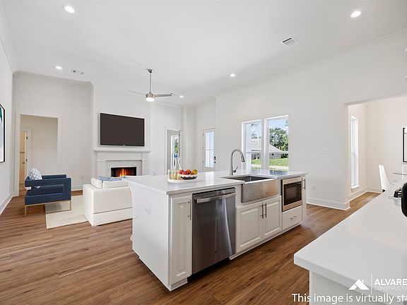 Oak Colony is an exclusively built new home community in Baton Rouge by Alvarez Construction Company. There are 148 estate sized homesites up to 300' deep with the average lot size .39 acres. Boulevard entrance welcomes residents lined with benches and meandering sidewalks, community ponds and mature live oak trees. Community includes over 19 acres of green spaces, sidewalks, curb and gutter and mailbox clusters. Oak Colony is located in south Baton Rouge off of Hoo Shoo Too Rd. No flood insurance required. All homes include a WiFi-enabled SmartHome management hub with a wireless security system and exterior security camera. Three months of alarm monitoring is included. Homes include a WiFi-enabled garage door, wireless smoke/heat combination detector and WiFi-enabled thermostat. Visit the Build Smart area on our website to find additional smart home information. The Bear Oak plan is a 4bed/3bath single story home offering open and spacious living areas with 12' high ceilings. Living room features a 36" ventless gas fireplace and is open to the kitchen with an attached formal dining. Kitchen features a large island, GE stainless steel smart appliances, 4 burner gas cooktop, separate wall oven and walk-in pantry. Private Master bedroom has en-suite bathroom with dual vanities, tiled walk-in shower, garden tub, WC, and generous walk-in closet. 3cm granite counters in kitchen and all baths. Bedroom 4 has private en-suite full bathroom. LVT and hardwood floors and oversized ceramic throughout the home with carpet in the bedrooms. Eva Fireplace mantel ,fireplace tile level 4,utility room mud bench,adding cabinets to the utility Upgrade lvp in all bedrooms and primary closet , level 3 gourmet kitchen upgrade, cabinets to ceiling upgrade, level 1 quartz, level 4 backsplash in kitchen, trash can pull out,soft close cabinets and drawers,lighting upgrade dart satin,soft close toilet seat, level 2 cabinet hardware upgrade, sweater box in primary