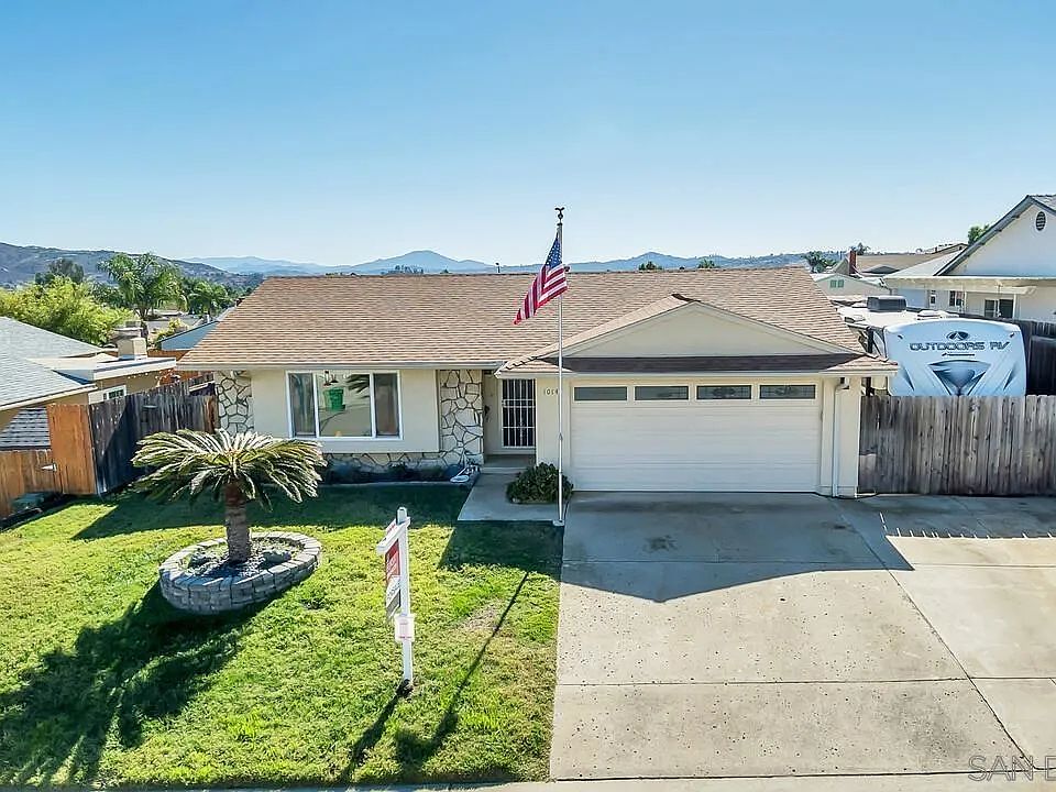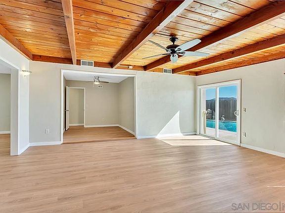 Wonderful family home in the heart of Santee with Sparkling Pool! This beautifully maintained property boasts freshly painted interior & brand new luxury vinyl plank flooring that flows throughout. As you step inside you'll immediately appreciate the bright and airy atmosphere. The large family room features a beautiful wood beamed ceiling that adds character and warmth to the space. This room seamlessly flows into the open concept kitchen, complete with bar top counter seating, making it the perfect spot for family gatherings and entertaining friends.