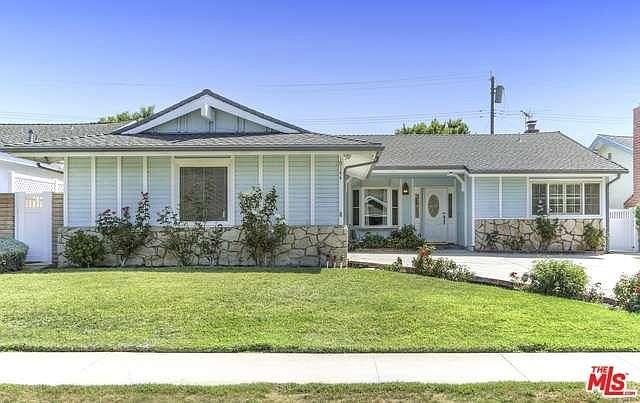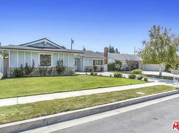 Nestled in the most desirable Chatsworth neighborhood, is this wonderful one-story Mid-Century Traditional. Situated in a quiet pocket w/sidewalks & speedbumps, it's inviting curb appeal is accentuated by light blue exterior siding & beautiful stonework fa~ade. Wood/glass entryway invites you into well-cared for home w/comfortable floorplan/layout. Large Master BR w/double closets, en-suite master BA completely redone w/glass shower, soft-hued granite & double sinks. Perfect-sized kitchen w/tastefully redone quartz countertop & picture window overlooking bckyrd. Large open space for FR/study/home office. Down a 2nd hallway are two more well-sized BR's, 2nd BR has classic wood siding & a warm cozy feeling, separated by hall bath w/quartz cntertops, dble sinks, & updated cabinetry. Combined LR/DR is perfect for entertaining, wall-to-wall stone frplc as cntrpiece & dble French doors - perfect indoor-outdoor flow. 2-car garage, laundry, HVAC. This home & neighborhood will not disappoint!