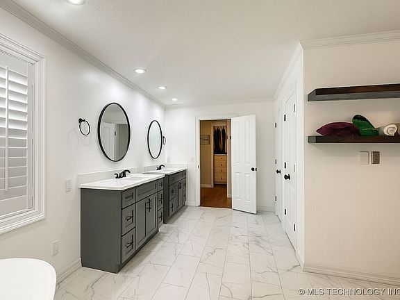 Stone patioInviting foyerFreestanding tubLuxurious primary suiteDual vanitiesElegant crown moldingSpa-like bathroom