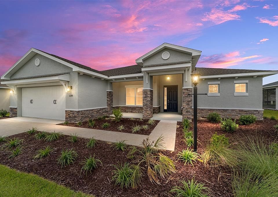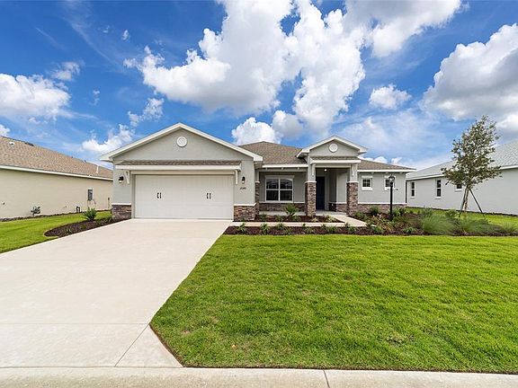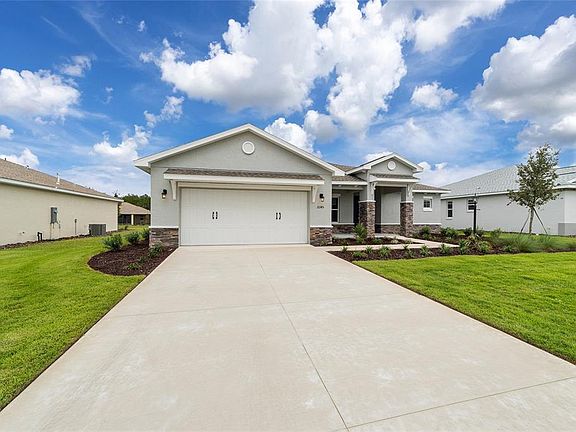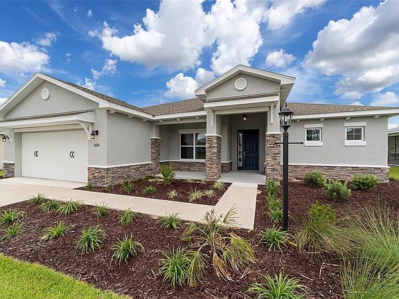 Beautiful Livingston model in the sought-after LongLeaf Ridge neighborhood at On Top of the World! This 2-bed, 2-bath home offers a 2-car garage with additional golf cart parking. The front of the home features an open flex room, perfect for an office or den. The modern kitchen showcases stainless steel appliances, two-toned cabinetry with crown molding, quartz countertops, under-cabinet lighting, a large island, walk-in pantry, and elegant backsplash. The living area flows seamlessly to a screened lanai through a 3-panel sliding door, ideal for relaxing or entertaining. The dining area is surrounded by three floor-to-ceiling windows overlooking the backyard. The luxurious primary suite includes a walk-in closet and ensuite with double vanity, quartz countertops, and a zero-entry tiled walk-in shower with built-in bench. Guest bedroom and bath provide comfort and privacy. Enjoy the vibrant lifestyle and world-class amenities On Top of the World offers, including golf, clubhouses, fitness centers, pools, and countless social and recreational activities for active adults.