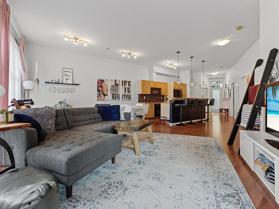 Welcome to your perfectly located downtown condo oasis! Situated in The Gates of Twelfth, this stunning, move-in ready, 2-bed+2-bath AIR CONDITIONED condo is just shy of 1000 sq.ft & offers a modern open concept floor plan. Steps from Jasper Ave & within walking distance to Grant MacEwan, Norquest College, restaurants, shops, nightlife & public transit, this home is ideal for young professionals, investors and students! Step inside & you are greeted by the front foyer that flows seamlessly into the kitchen with solid maple cabinetry & breakfast bar & overlooks the SPACIOUS living room & dining room. Soaring 10 FT CEILINGS & wall-to-wall south-facing windows, this unit is flooded with natural light. The primary bedroom features a walk-in closet & a LARGE ENSUITE with a double wide shower, and rounding off the space is a 2nd bedroom, 4pc bathroom, INSUITE LAUNDRY & south facing balcony with natural gas hookup. The property also includes an underground parking stall, along with an additional storage cage!