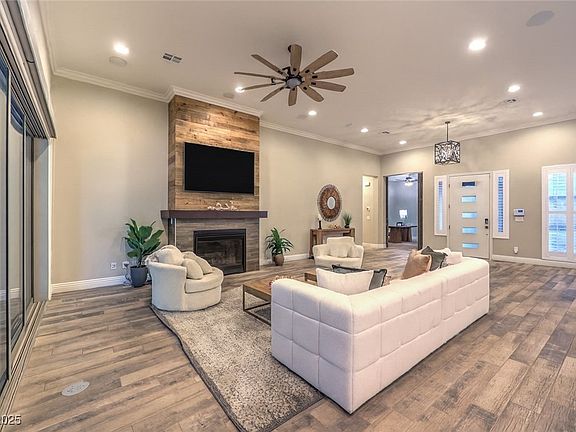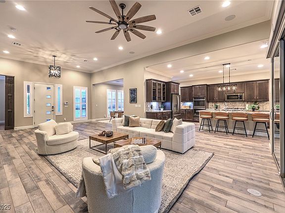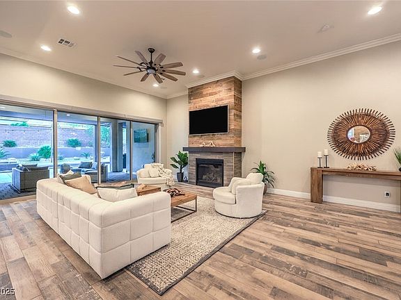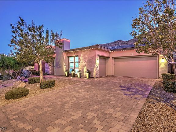 Discover this exclusive single-story home in the gated community of Onyx Point at The Cliffs in Summerlin, blending modern luxury with timeless design. A private courtyard leads to an open great room, study with barn doors, and a detached casita—all totaling 3,355 sq ft. A dramatic 18-ft stackable slider opens to an entertainer’s dream yard with saltwater pool, spa, tanning ledge, outdoor kitchen, firepit, and stunning mountain views. The chef’s kitchen features an extended island, butler’s pantry, breakfast nook, and wine fridge. The primary suite offers a spa-inspired bath with dual walk-in closets. Highlights include a modern fireplace, crown molding, paneled walls, shutters, 8’ doors, 10’ ceilings, paid off solar, security system, tankless water heater, reverse osmosis, paver driveway, custom lighting, and a full-length Alumawood patio cover. Resort-style living meets modern sophistication in the heart of Summerlin.