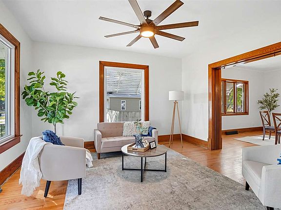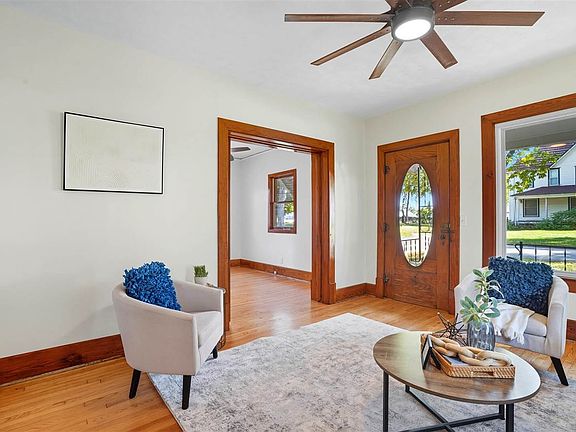 Nestled on the north end of town in a charming rural community, this extensively remodeled home still retains much of its original character! The new eat-in kitchen features quartz countertops, white cabinetry, new appliances, a farmhouse-style sink, & soft brushed gold faucet. A spacious living room & formal dining room with large windows bring in an abundance of natural light. The main level offers two bedrooms with shared bath access; one room doubles nicely as an office & includes a working pocket door. Stylish farmhouse lighting, updated hardware, & touches of antique detail add to the home’s unique appeal. Conveniently located main-floor laundry & a versatile drop-zone area perfect for a bench & cubbies. Original HW floors have been professionally refinished, complemented by new hickory LVP flooring. The lower level & walk-up attic provide excellent potential for additional living space. Outdoor spaces include a welcoming front porch, a brand-new back deck, & a usable yard shaded by mature trees. Additional highlights: 1-car attached garage with workbench, newer garage door, new furnace 2022, new roof, updated electrical with 200-amp service, hardwired smoke detectors, new sump pump, all new plumbing, new water heater, central A/C, added insulation, & professional foundation repairs by Goodwin.