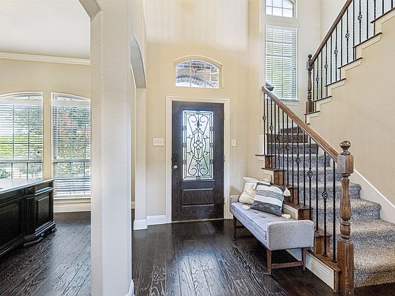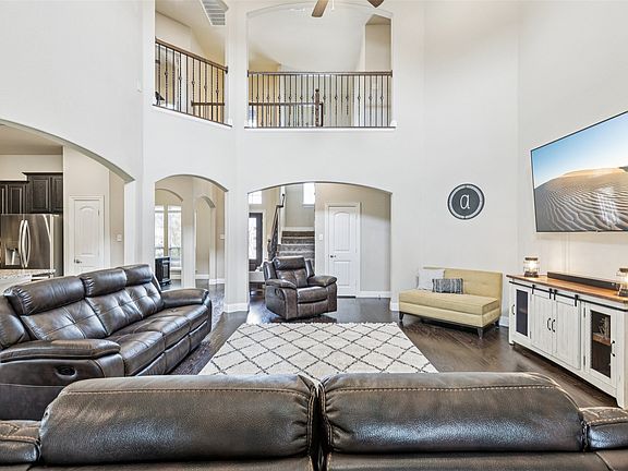 Beautiful stone front and striking stone accent wall in front of the home gives this spacious home a stately presence. Inside, the open-concept design is flooded with natural light, and soaring ceilings create an airy, fresh atmosphere. At the heart of the home is the large living room with dramatic high ceilings and a cozy corner fireplace, seamlessly connected to the kitchen. The kitchen features an island breakfast bar, gas cooktop, pantry, stainless steel appliances, and a sunlit breakfast room. Roof replaced in 2023. Enjoy the outdoors from the expansive covered patio overlooking a serene greenbelt. Upstairs is a large bonus room with double doors, currently used as a bedroom. The layout is ideal for multigenerational living or guests, with the primary suite and a secondary bedroom plus full bath conveniently located downstairs. Fantastic neighborhood with excellent schools, including walkability to Grace Hartman Elementary. Take a golf cart to The Shores community or Rockwall Golf Club. Residents enjoy a community swimming pool and are less than 2 miles from the Lake Ray Hubbard boat ramp and marina. Motivated Seller! Schedule your showing today—this gem won’t last!
