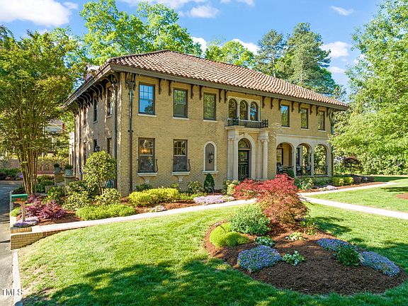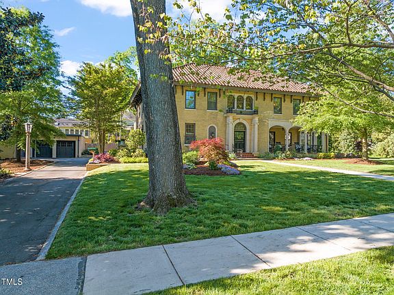 Nestled on a uniquely large quadruple lot along a serene, tree-lined street in the heart of Trinity Park, this home embodies timeless elegance and historic charm. Constructed in 1925 with extraordinary craftsmanship, it has been meticulously maintained and thoughtfully updated by its current owner, making it one of the most significant properties in decades to be offered for sale Durham's historic and walkable neighborhoods. Inside, the home's grand dining room, spacious living area, and expansive front porch reveal a legacy and future of large gatherings. Inviting bedrooms with generous closets and beautifully updated bathrooms offer a peaceful retreat amid the vibrant surroundings of Durham and Duke University. This Renaissance Revival masterpiece was originally commissioned by Benjamin Kronheimer, one of Durham's ''Merchant Princes,'' who sought out celebrated architect Nelson G. Murray—the same visionary behind Duke University's Hart House—to design a residence of unparalleled quality. Murray delivered on every detail, using the finest materials and sparing no expense to ensure lasting grandeur. The 4,667-square-foot estate known as ''Rose Villa'' spans a lush 0.69-acre lot and includes a detached garage and workshop, ample for any creative endeavor. The kitchen is a dream for serious cooks, featuring bar-top seating, a breakfast nook, a butler's pantry, and abundant storage. The home's original trim, doors, and hardware have been preserved, while modern comforts seamlessly blend in: five large bedrooms, four full baths (three recently updated), two half baths, and two functional fireplaces. Outside, the manicured landscaping is replete with native varietals. Located just a block from Duke's East Campus and within walking distance to Whole Foods, Brightleaf, and many of Durham's best offerings, this property combines the essence of history with the energy of a walkable lifestyle. The owners have, during their 30 year ownership, been exceptional stewards of this architectural masterpiece. All flat roofs have recently been re-surfaced with modern rubber membrane roofing. Even more impressively, every single terra cotta roof tile was removed, and new waterproof membrane installed. The tiles were carefully inspected, and any cracked ones were replaced before re-installation of the roof surface, ensuring it's reliability for at least another 50 years. The home is heated by a boiler & radiators, which are reliable and add a nice consistent warmth to the home. The highly efficient Boiler is less than 2 years old. Central air conditioning is provided by 3 forced air units, all less than 10 years old. The ductwork is well-fabricated from sheet metal and insulated. The original electrical system was commercial BX shielded cable (not the more common knob & tube). There is a modern main panel & sub panels feeding updated Romex cable in kitchen & bathrooms and for HVAC circuits. An electrician with 30+ years experience evaluated and said the main house system is safe and reliable as-is. All in all, this is an extraordinary opportunity for a discerning buyer to own a crown jewel of Durham history, in move-in ready condition.
