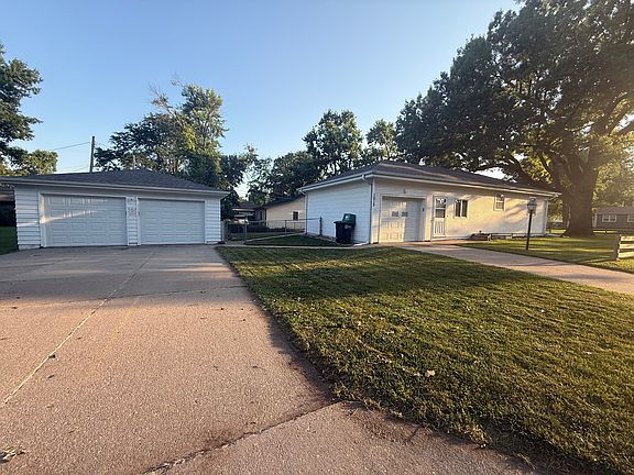 1 car garage attached and large 2 car detached garage each has its own driveway on a large corner lot.