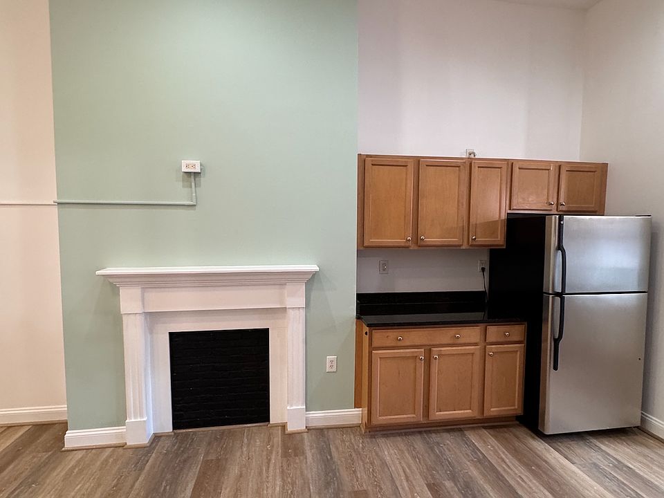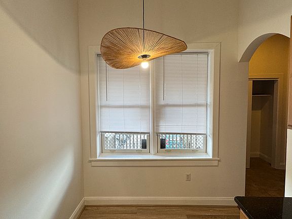 renovated one bedroom apartment with new LVT flooring, charming accent walls, high ceilings, fireplace, custom rattan shade in dining area and a private porch off of kitchen!