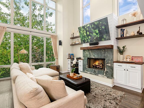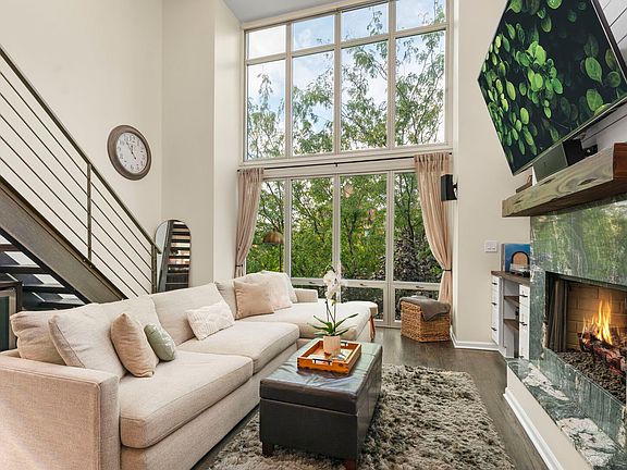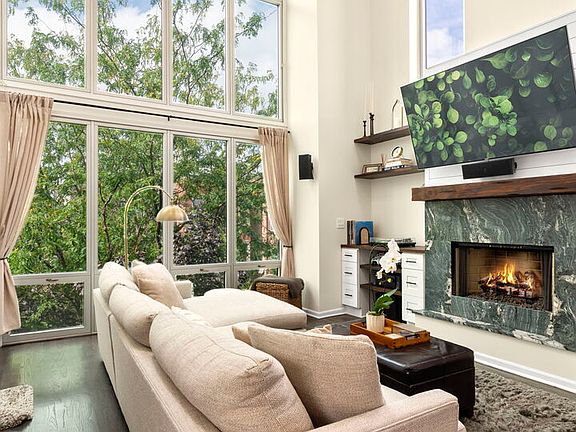 Live at the center of it all in this stunning duplex-up penthouse located in the heart of Wicker Park. This move-in ready, 3 bed, 2 bath home features a dramatic two-story living room with oversized windows, flooding the space with natural light and showcasing the open, airy layout with tree-top views. Living room has thoughtful built-ins maximizing storage including dry bar and 2 built-ins/shelving flanking the gas fireplace. Open kitchen features high-end appliances, island with breakfast bar, filtered water system & modern finishes. 2 bedrooms share newly redone bathroom on main level. Upstairs welcomes the gorgeous, completely renovated primary suite featuring high ceilings, custom built-in with quartz counters, ample closets. Beautiful primary bathroom features double sinks, glass shower, free standing tub and picture window highlighting the fantastic views. Enjoy two private outdoor spaces, including an ideal rooftop deck with jaw-dropping skyline views, perfect for entertaining or as your relaxing city oasis. 1 garage parking space included. Hardwood floors throughout. In-unit washer & dryer. Private entrance. Numerous updates throughout. Don't miss this special home!