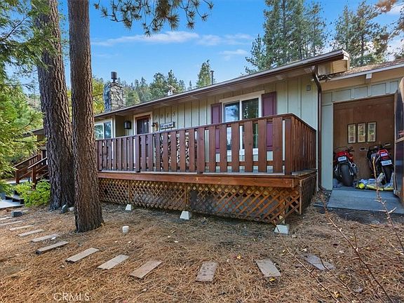Don’t miss this opportunity to purchase a coveted home in the quiet “bird streets” of Wrightwood. This beautifully renovated ranch style home boasts cathedral pine ceilings punctuated by two skylights, a designer kitchen with granite counters and island, stainless steel appliances and an attached 2 car fully insulated garage with a huge storage loft. The main double sink, stone floor bathroom is accessible either from the hallway or the primary bedroom through a cleverly placed pocket door. The high ceiling guest bedroom can also function as a commodious office. The mud room conveniently connects to another pocket door bathroom. There is also an adorable finished and insulated outbuilding currently serving as a library/reading room retreat. An additional insulated 100 square foot storage structure has been seamlessly integrated along the side of the house, adding efficiency and complimenting the exterior appeal of the home. The proximity to the village and the Acorn Trail allows you to walk for errands and activities without having to drive. A mountain oasis with hot tub and outdoor shower to soothe your soul. The rooftop solar panels produce an energy credit every year! The huge enameled wood stove insert provides warmth and beauty surrounded by a stone hearth and custom cabinetry. A Brace and Bolt earthquake retrofit and recent efficient central heating and air conditioning system ensure you’re cozy and comfortable all four seasons with a Wi-Fi controlled thermostat. The numerous trees on the land not only provide shade and serenity, several also produce, pears, nectarines and apricots. You won’t want to miss this lovely home.