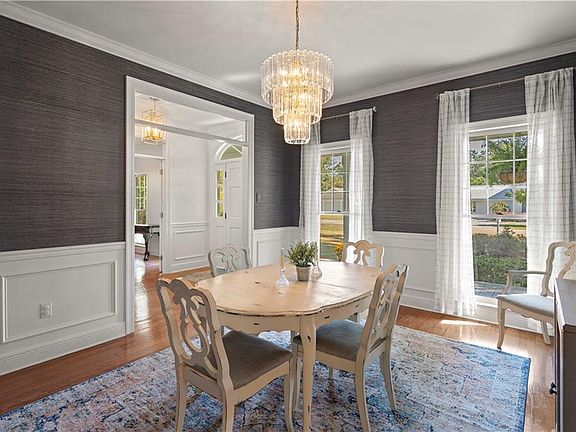 A covered front porch with a classic swing welcomes you inside, setting the tone for the warm, inviting atmosphere throughout. The open floor plan features refinished hardwood floors, abundant natural light, and designer finishes that enhance every space. The renovated kitchen boasts stone countertops, stainless steel appliances, and a breakfast bar—great for family meals or entertaining guests.