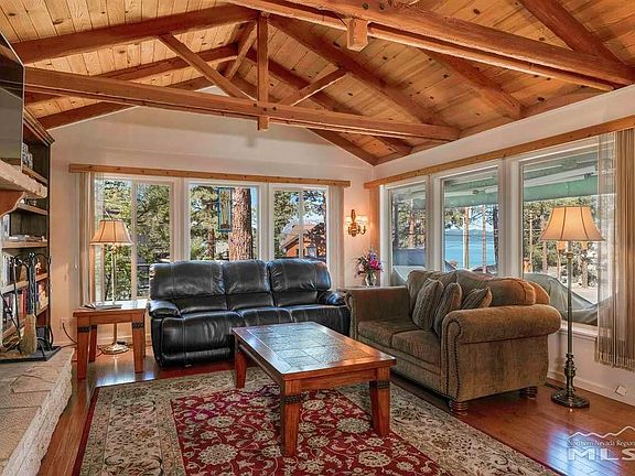 You can't get much closer to the lake and beach without owning a lakefront home, than this well maintained Skyland home, located directly across the street from the lake and Skyland's Homeowner's Beach. Relaxing on the sun filled front deck, while enjoying the beautiful lake views & the Tahoe lifestyle everyone dreams of. The well maintained home has a spacious great room with vaulted open wood beam ceilings, wood burning fireplace, with access to the front deck. The kitchen features a Thermador double